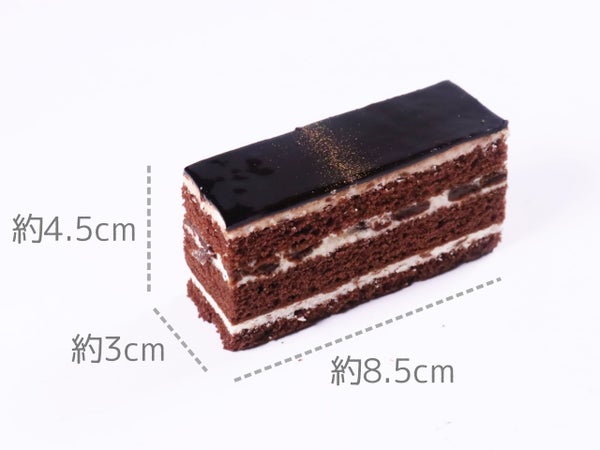 ココアスポンジとラムレーズン入りクリームとラム酒漬けのレーズンをたっぷりとサンドし、上面にグラサージュチョコを重ね、ワンポイントに金粉を掛けました。大人向けのテイストに仕上げています。
