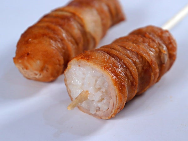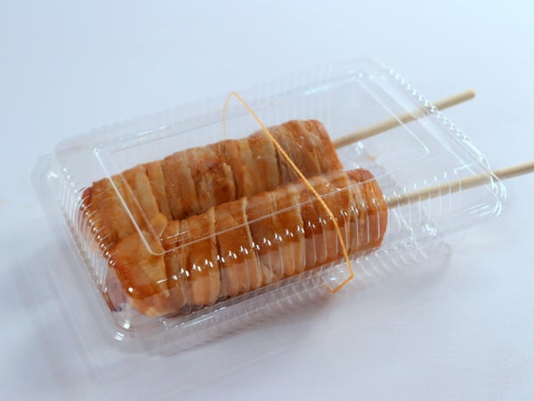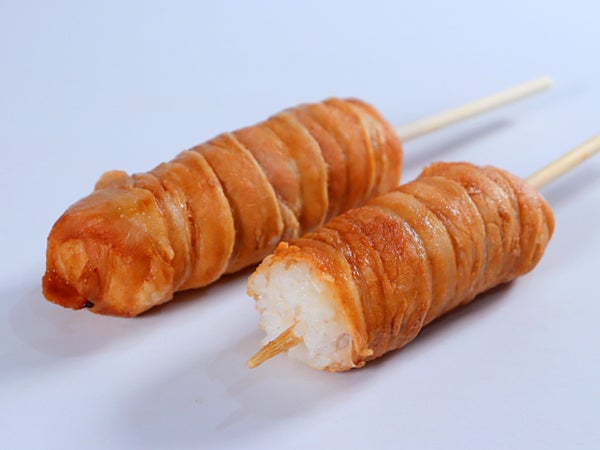 ごはんにチーズをまぜ込み、串に刺し、豚肉を巻きつけたおにぎり棒です。ご飯と相性の良いタレで味付けし、焼き上げました。温めるだけで簡単に提供ができます。お祭りなどのイベントに最適です。