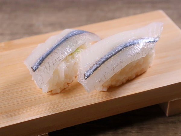 透明感のあるスライス済のサヨリです。味は淡白ですが身の食感はしっかりあります。銀・青のコントラストがキレイな「肌目」は清涼感があり、クセがなく、ワンフローズンの鮮度の良さが感じられます。