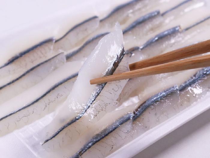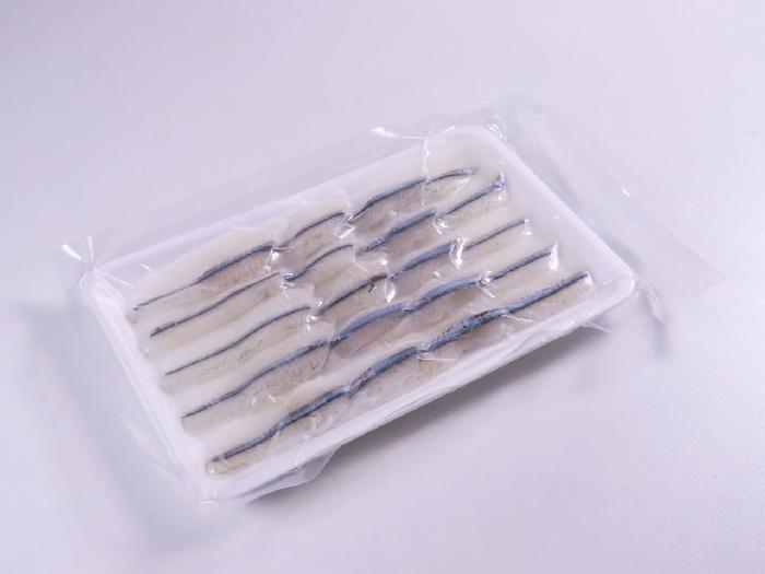 透明感のあるスライス済のサヨリです。味は淡白ですが身の食感はしっかりあります。銀・青のコントラストがキレイな「肌目」は清涼感があり、クセがなく、ワンフローズンの鮮度の良さが感じられます。