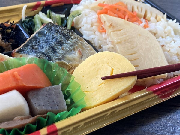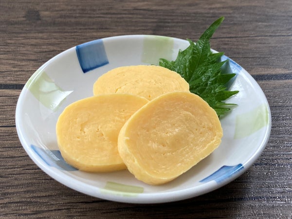 薄めにスライスした丸いだし巻きたまご。しっとりとした口当たりで、塩味控えめのやさしいだし味です。