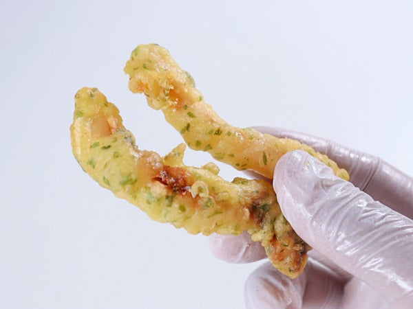 いかの耳と胴体をスティック状にカットし、塩味と香り豊かなあおさの衣にくぐらせた明るい色合いのいか天です。シンプルな味付けがいかの美味しさを引き立てます。サクッと軽い食感の天ぷら衣は、冷めてもその食感が長続きするよう設計しました。