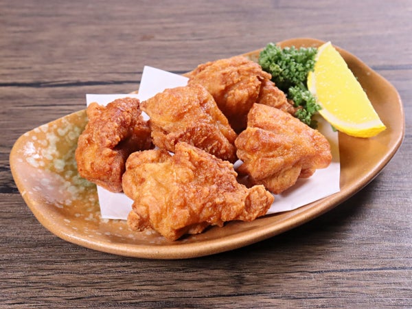 しょうがにんにく醤油で味付けしたベーシックな鶏もも唐揚げ。揚げ色は比較的明るめです。