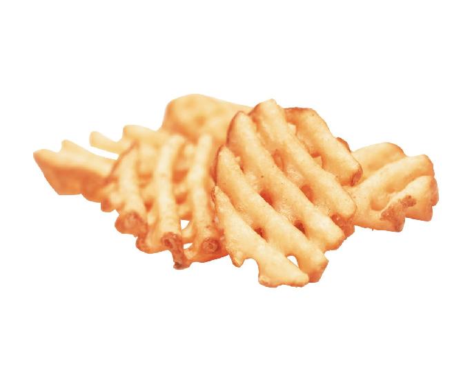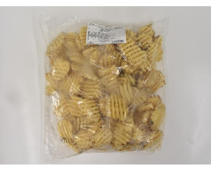 格子状のワッフルカットポテトで、塩味の衣を厚くコーティングした経時変化に強い商品です。ソースによく絡むワッフルタイプで、珍しい形が目を引きます。