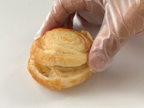 巻いたクロワッサン生地を切り分けて焼成。シナモンロールのような渦巻き模様がかわいいです。