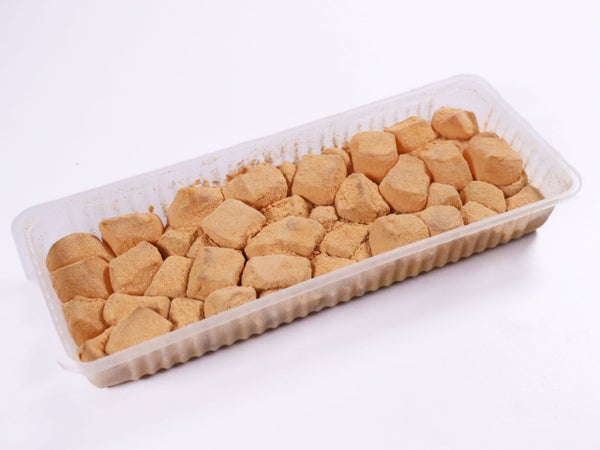 わらび餅の重なりが少なく解凍が早い形態です。緩慢解凍(冷蔵庫解凍など)では固くなることがあるので、時間をかけずに常温にするのが上手な解凍です。解凍後は冷蔵庫で冷やしたり保存しても大丈夫です。