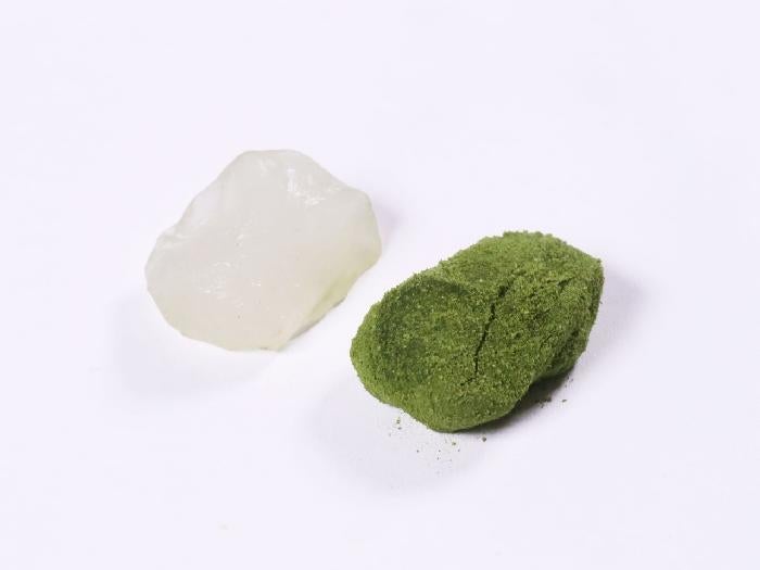 柔らかく、やや小さめで、適度にいびつで自然な形をしたわらび餅です。抹茶入りきなこをたっぷりまぶしました。
