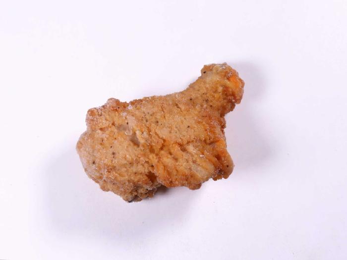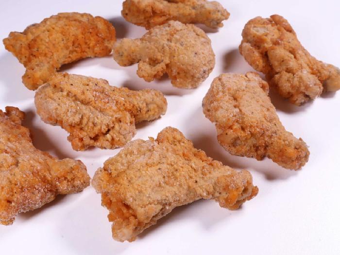 鶏骨つきもも肉、食塩、植物性たん白、でん粉、香辛料、しょう油、酵母エキス、小麦粉、砂糖、衣(でん粉、パン粉、小麦粉、砂糖、香辛料、植物油脂、食塩、ぶどう糖)、揚げ油(大豆油)/調味料(アミノ酸)、加工デンプン、ポリリン酸Na、増粘剤(グァーガム)、重曹、パプリカ色素、(一部に小麦・大豆・鶏肉を含む)