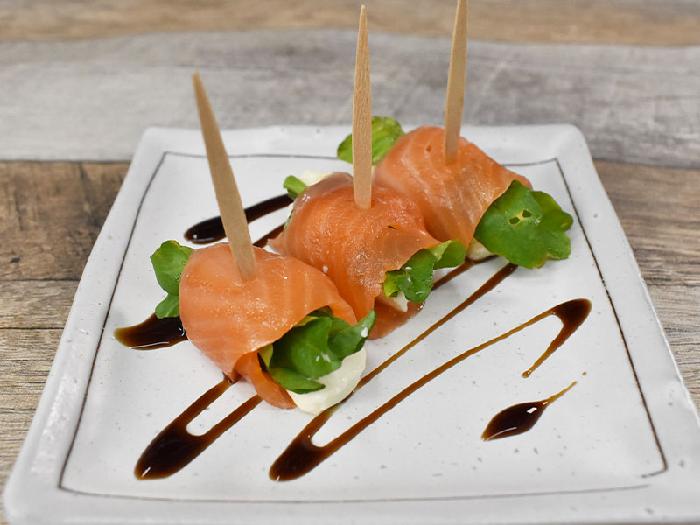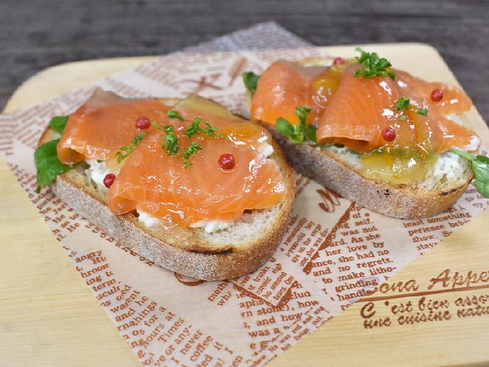 青森サーモンをスモークし、約3mmのスライスにしました。