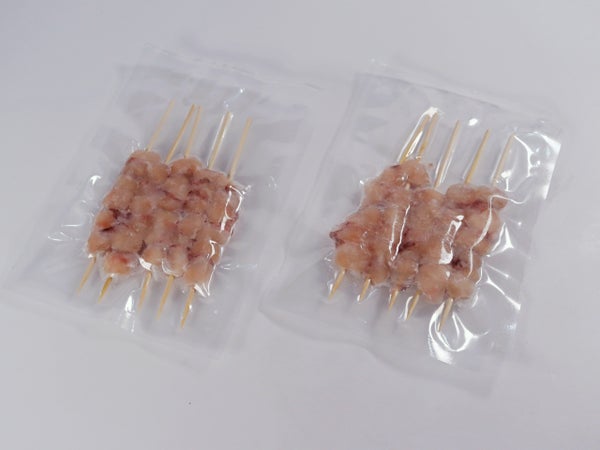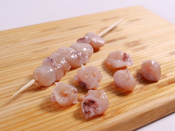 「とんび」とか「くちばし」ともいわれる、いかのくち部分です。丁寧に歯や殻を外し、5~6粒ずつ丁寧に串を打ちました。小さい串ですが、ひと粒ひと粒にしっかりうまみが詰まっていて、お酒のおつまみにおすすめです。