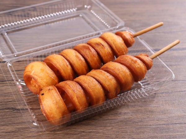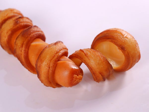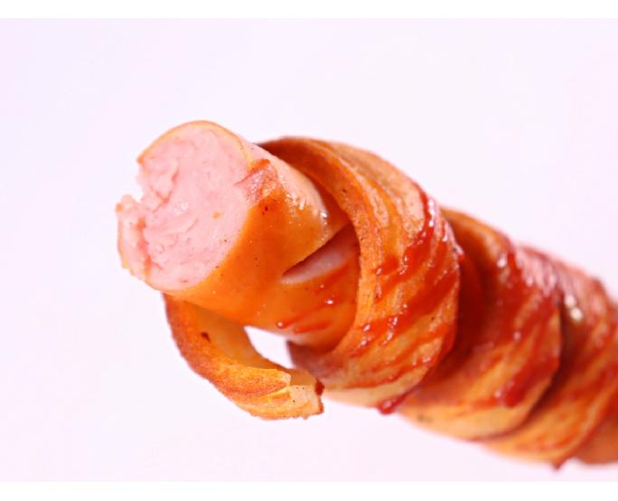 スパイシーなフランクのまわりに、チュロス風生地をトルネード状に巻きつけた、ボリュームとインパクトのあるワンハンドスナックです。食べ歩きグルメやイベントの店頭販売で目を惹くこと間違いなし。