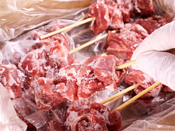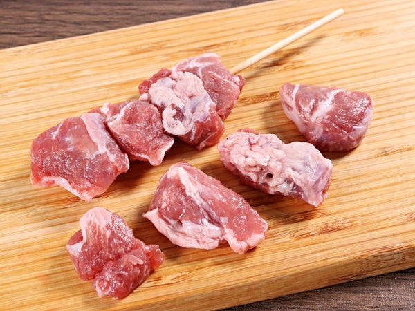 ほほからこめかみにかけた、豚の頭の肉です。カットして4個ほどを刺しています。
