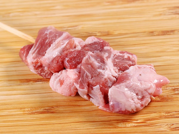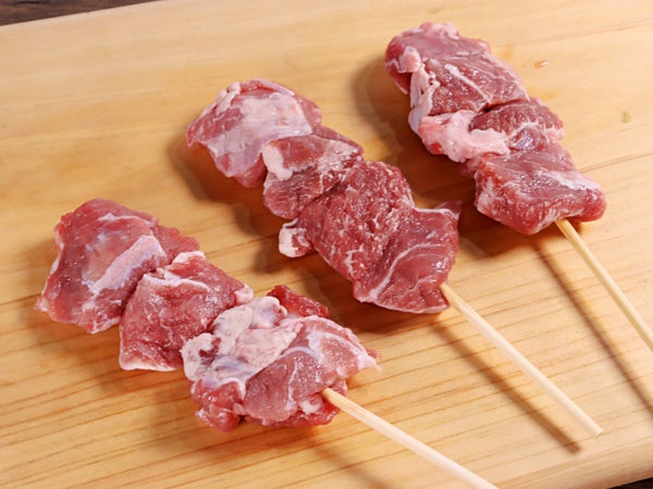 豚かしら(ホホとコメカミ)を串に刺しました。やきとんの定番メニューです。大きめカットで刺しました。塩焼きがおススメ。和からしはもちろん、辛味噌ダレを付け食べるのもおすすめです。