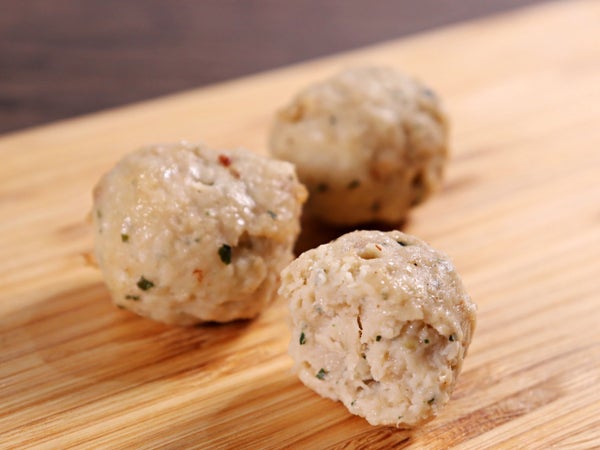 刻み込んだ大葉が鼻の奥に香ります。玉ねぎのうまみを加え、卵とパン粉をつなぎに使用しています。油調加熱済みですが、揚げ色はついていません。