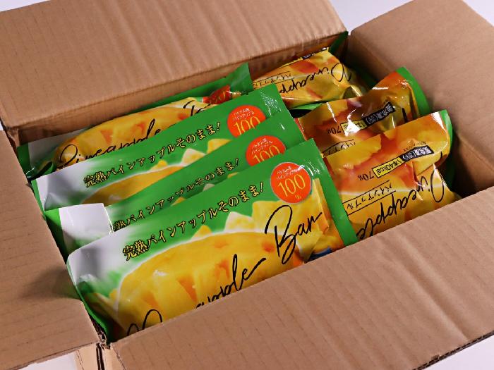 完熟果実をカットしてスティックに刺した、冷凍のまま食べるフルーツバーです。ベトナム産の完熟ゴールデンパインアップルなので、冷たくても甘みをしっかり感じられます。アイスキャンディーではないので、解凍しても溶け流れることなくフルーツとして食べられます。