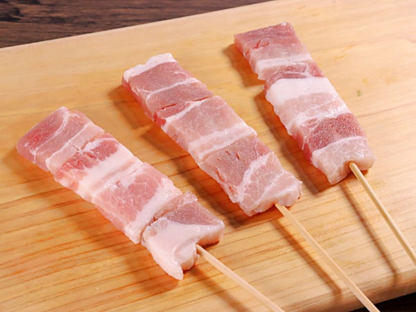 スライスした豚バラ肉をカットして、約4枚を長めの18cm串で打ちました。