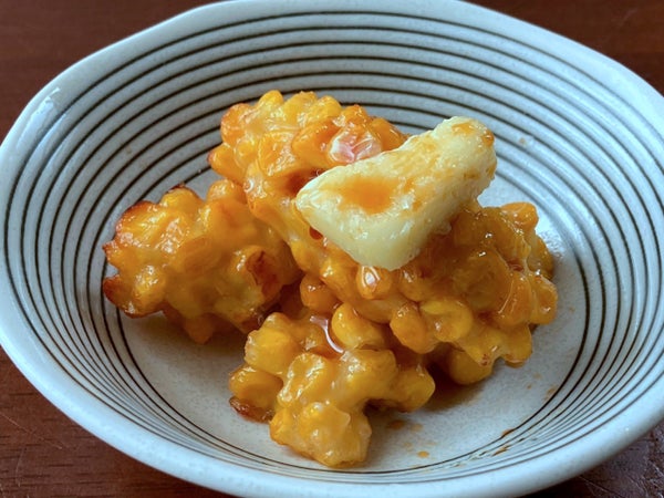 いとよりだいのすり身にとうもろこしを合わせ、よせ揚げにしました。しょうゆダレをかけて焼きとうもろこしのような香ばしさを再現しました。ふんだんに使用したとうもろこしの甘さが味わえる仕立てです。
