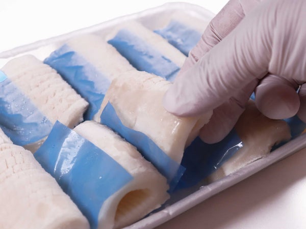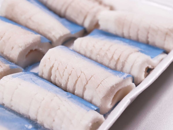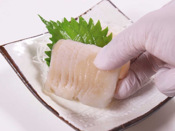 国産のあかいかを細切りにしたいかそうめんです。1枚(柵)ずつ盛り付けやすいようフィルムで巻き、波盛に並べました。あかいか特有のねっとりとした食感が特徴です。