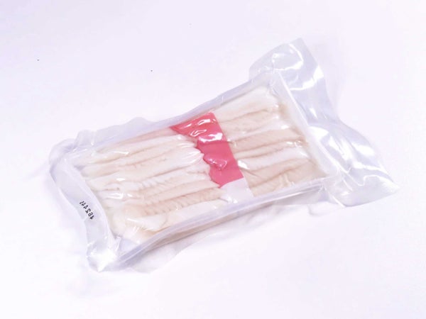 あかいかを刺身・寿司ネタ用にスライスしました。あかいか特有のねっとりとした食感が特徴です。解凍するだけで提供ができ、利便性に優れた商品です。