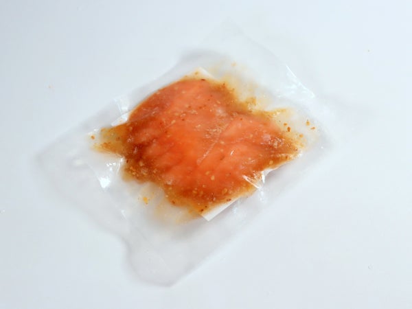 トラウトサーモン(チリ産養殖又はトルコ産養殖)、液体塩こうじ、砂糖、醤油、かつおエキス、胡麻、昆布エキス、胡麻油、食塩、ガーリックパウダー、粉末生姜/pH調整剤、増粘剤(キサンタンガム)、(一部にさけ・大豆・小麦・ごまを含む)