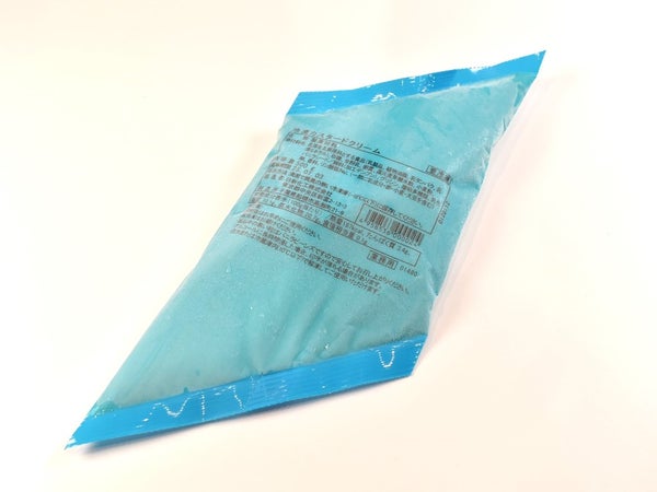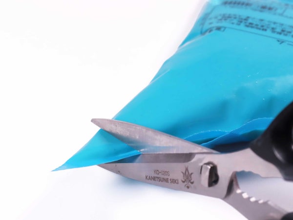 パックの先をお好みの太さで切ってください。切れ端の混入を防ぐ青色包材です。