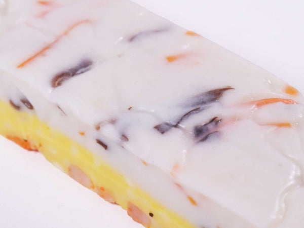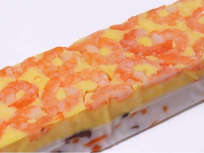 下の層はすり身に人参・きくらげを加えたしんじょうに、上の層はすり身とゆで卵で彩り良くマヨネーズの風味を仕上げたしんじょうにむきえびをトッピングした二層のオードブルです。えびのぷりぷりした食感と卵のほろっとした口当たりが楽しめる、彩り豊かなオードブルです。