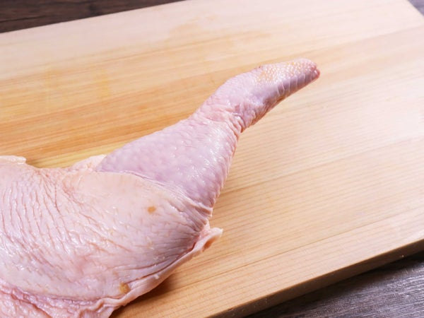 かかと部分まで残した「ロングレッグ」。クリスマスチキンなどのチャップ花(紙や銀紙の飾り巻き)がここに付けられます。