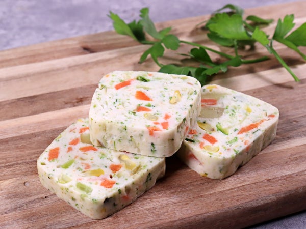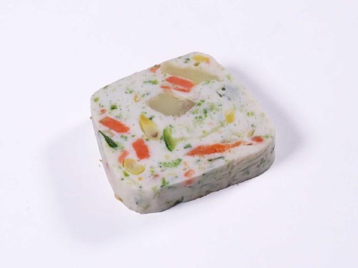 サーモンと色とりどりの野菜(ブロッコリー・とうもろこし・ズッキーニ等)を練り込んだ、美しい彩りのテリーヌです。