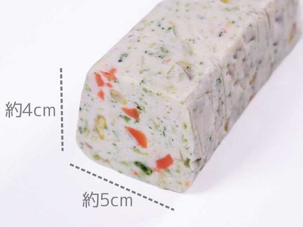 魚肉(いとより(輸入)、紅鮭、はも、たら)、乳等を主要原料とする食品、ブロッコリー、トウモロコシ、ズッキーニ、大豆油、ジャガイモ、タマネギ、ニンジン、セロリ、砂糖、乾燥卵白、食塩、小麦たん白、オニオンエキスパウダー、人参エキスパウダー/加工デンプン、グリシン、調味料(アミノ酸等)、焼成Ca、増粘剤(グァー)、酸化防止剤(V.C、V.E)、くん液、酸味料、(一部に小麦・卵・乳成分・さけ・大豆を含む)