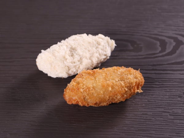 大粒として十分なインパクトを残せるサイズのカキフライです。かき身と衣のバランスが一番ちょうどいい大きさでもあります。岡山県の名産地・日生(ひなせ)のかきを愛媛県の工場で加工しています。