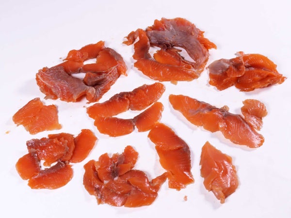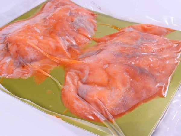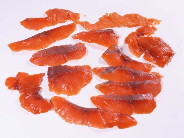 トラウトサーモンのスモークの切り落としをパックしました。赤い色合いと脂乗りはトラウトならでは。形は悪いですが味は変わりありません。