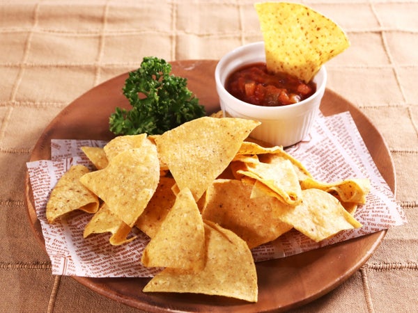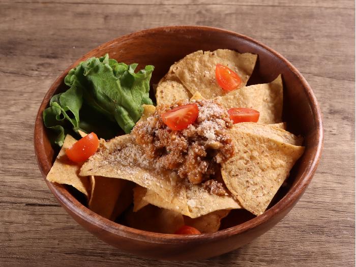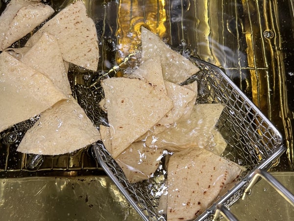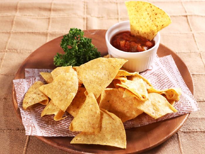 お店で揚げるトルティーヤチップスです。揚げ済み商品に比べて揚げたては食感が軽快です!