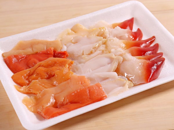 1トレーに3種類の貝刺身を6枚ずつアソートした盛り合わせパックです。