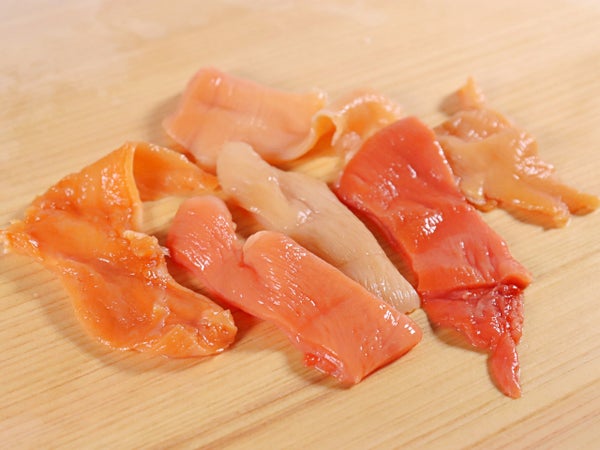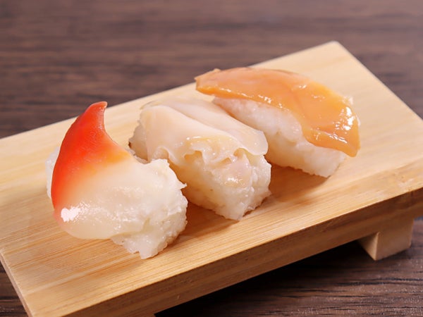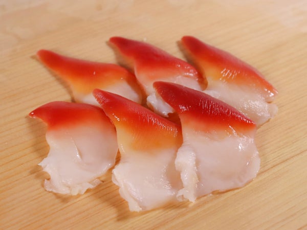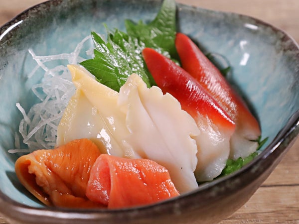 3種類の貝(ツブ貝・黒ミル貝・ホッキ貝)を刺身用にスライスした盛合せセットです。各6枚ずつ、それぞれ1枚約5~6gに仕立てました。色味の異なる種類をセットにし、見栄えの良さにもこだわりました。