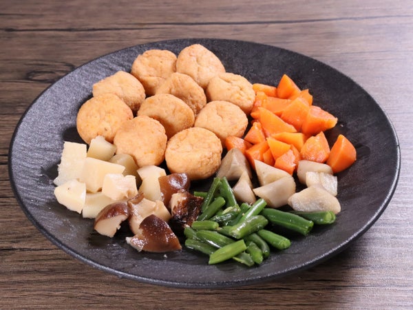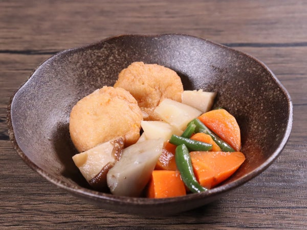 がんもと5種の野菜(ごぼう・筍・人参・いんげん・しいたけ)の煮物です。昆布・かつお・しいたけの旨味を効かせた和風だしで仕上げ、野菜の彩りにこだわりました。