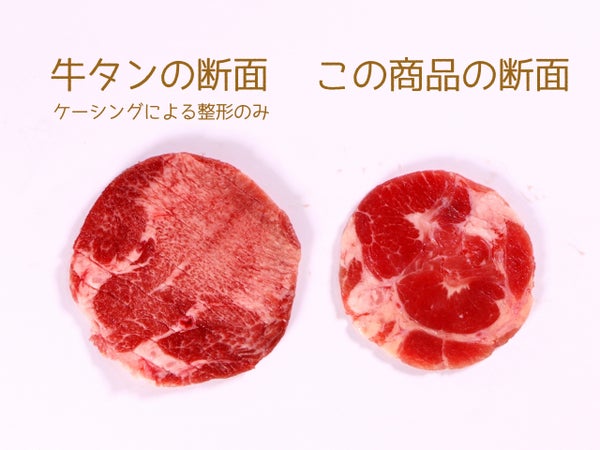 牛タンサガリ(タン下の部分)の小片肉を利用し、結着成型した牛タン材です。直径はやや細めの約6cm。