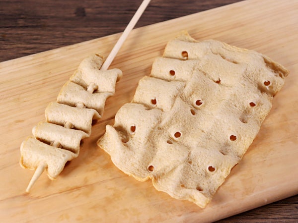 薄いさつま揚げ(魚すり身シート)を折りたたんで串で波打ちしています。
