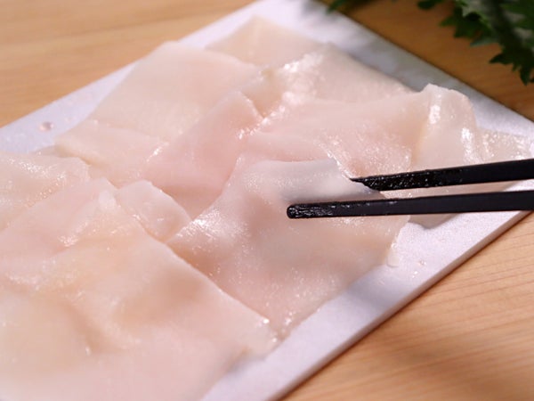 刺身用クジラ本皮(トイ)をスライスし、使い切りのパックにしました。解凍後そのまま盛り付けるだけで肉刺しの提供ができます。