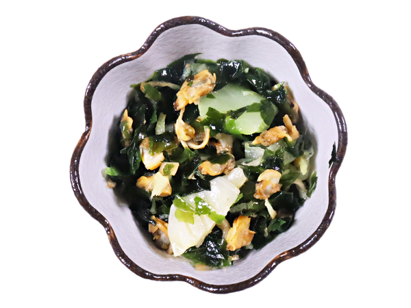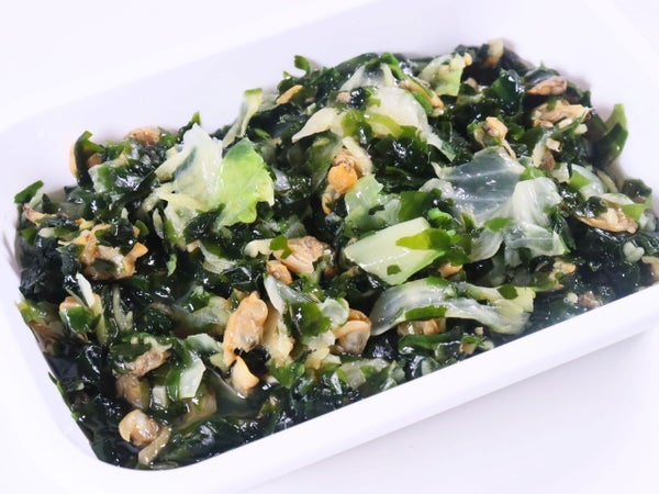 あさりのうまみをキャベツとわかめに吸わせた、しょうが入りだし味の和え物。