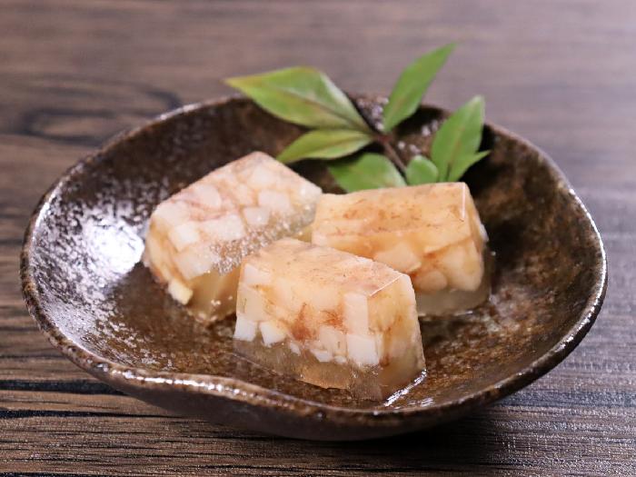 煮凝りだしのなかにはかつお節をちりばめ、土佐煮のような風味を味わえるようになっています。