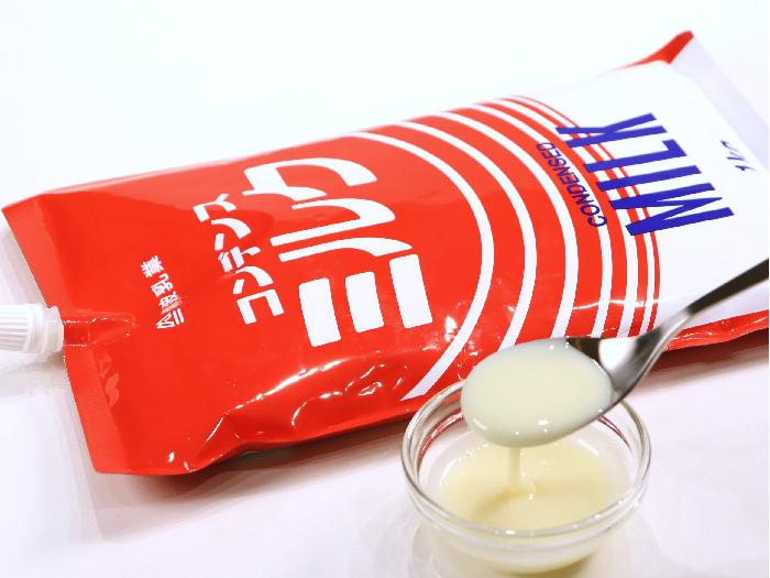 生乳にしょ糖を加えて濃縮し、スパウト付パウチに詰めた加糖練乳です。大容量ながら口栓付きで衛生的に注ぎやすい利便性があり、ご使用後の折りたたみや廃棄時の減容化を考慮したエコタイプです。かき氷やデザートのトッピングにうってつけです。