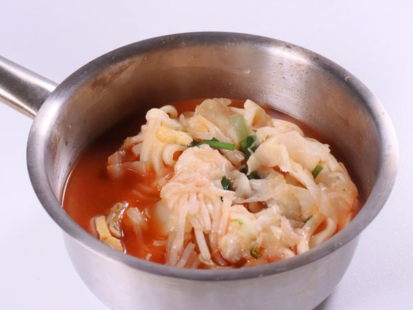 スープと水270mlを入れて沸かした鍋に、具付きの麺を入れて約4分煮てください。