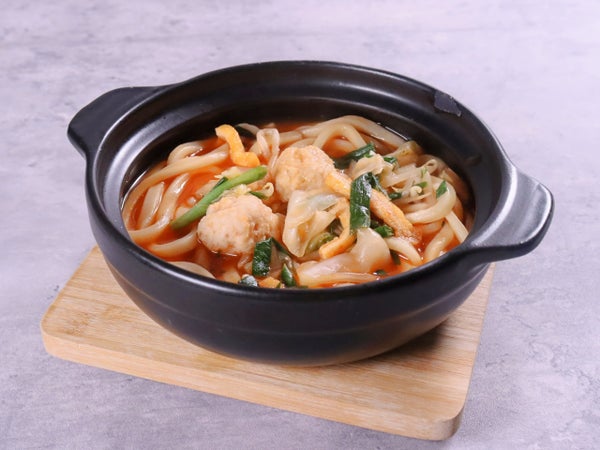 5種の具材(キャベツ、もやし、肉団子、にら、きざみ油揚げ)をトッピングし、味噌に豆板醤、コチジャンで、辛さにコクと旨みが入った、チゲうどんです。