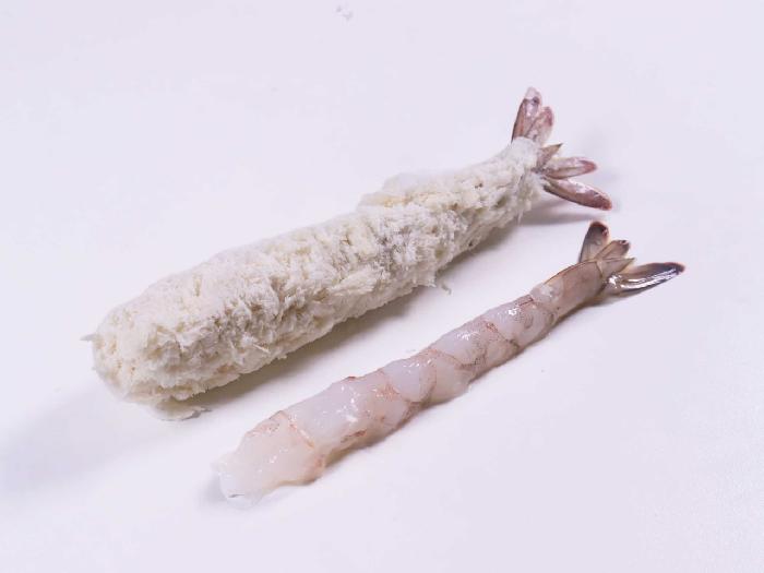 衣(パン粉、小麦粉、でん粉、食塩、粉末油脂、小麦たん白)、えび、食塩/加工デンプン、増粘剤(グァーガム)、調味料(アミノ酸)、pH調整剤、膨張剤、(一部に小麦・えびを含む)