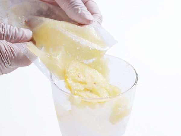 解凍後または冷凍のまま、レモネードの素をグラスに入れます。(やわらかくすぐに解けるので解凍せずに入れても大丈夫です。)