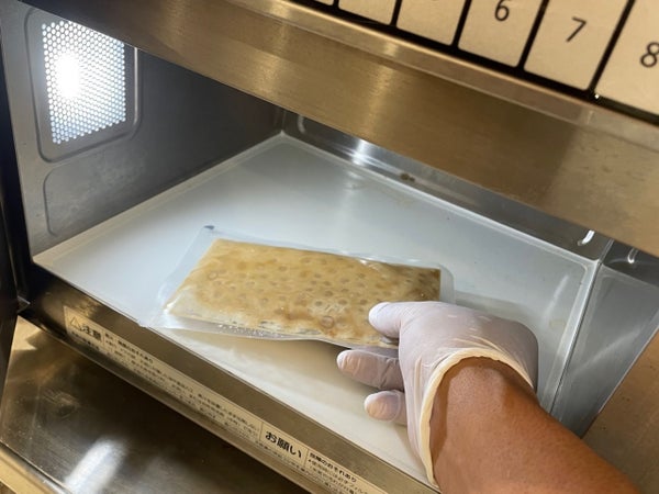【基本の作り方】①冷凍のパックをレンジで加熱解凍します。500Wで1分~1分30秒が目安、タピオカに透明感が出てやわらかくなったらOKです。注文が多い時にはまとめて湯せんしても可。