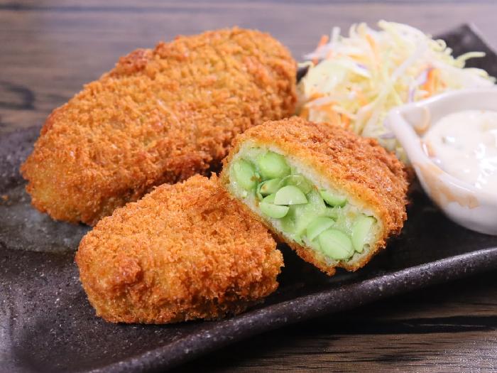 枝豆の素材の味を生かすよう、ほんのり塩味(赤穂の天塩使用)をつけたたっぷりの枝豆をフライに仕上げました。珍しい枝豆の揚物です。細長い形なので、食べ歩きにもおすすめです。