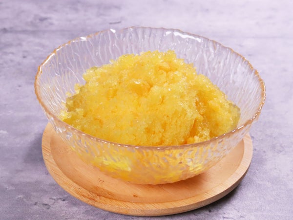 高度な製氷技術で作られた味付きかき氷に、刻んだマンゴー果肉を混ぜ込みました。