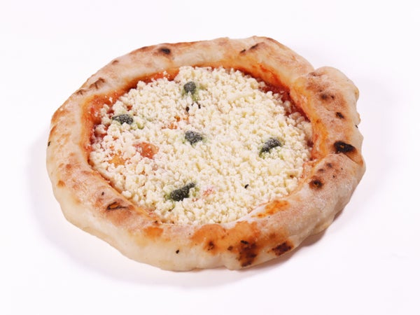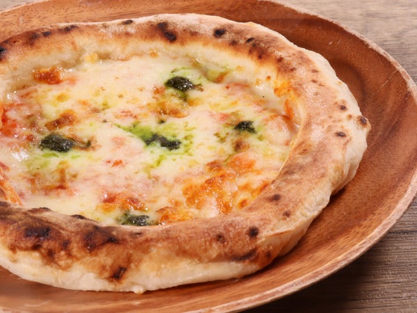 高温の窯(360~400℃)と低温の窯(330~370℃)で2段階の窯焼きをした手延ばし生地に、トマトソース・細かいビーズ状のチーズ・バジルオイルをトッピングしました。