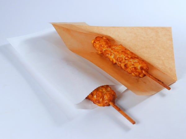 砂糖醤油に漬け込んだとうもろこしをたっぷり入れた練り天串です。屋台の味を再現した、イベントにもってこいの一品です。